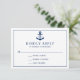 Nautiskt bröllop OSA-kort med ett marint blåankare med ditt monogram på vardera sidan och din händelseinformation omgiven av ett gräns, över en vit bakgrund. Baksidan är en passande skugga av marinblått. En enkel men elegant-design som är perfekt för en strand som temat firande på sommaren.