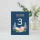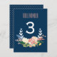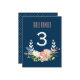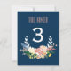 En fräsch och modern illustrerad blommig krans omger bordnumret på detta färgrika blush och marinblå blommiga bordskort.