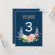 En fräsch och modern illustrerad blomsterkrans omger bordnumret på detta färgrika blush och marinblå blomsterkort.
