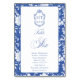 Delft blue floral table number card, designed in a refined blend of chinoiserie and French toile de Jouy style. The soft botanical illustrations frame an arched layout featuring an elegant wedding crest monogram, perfect for couples who love vintage, historic, and European-inspired aesthetics. Classic script typography pairs beautifully with the ceramic-blue palette, making this design an effortless nod to the tradition of “something blue.” Fully customizable with your names, wedding crest and in this design table number: Six, it’s an exquisite choice for any romantic or sophisticated wedding theme.