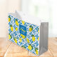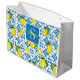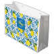 This gift bag features a watercolor French country tile and lemon pattern in blue and yellow. It is easily customizable with your name and monogram,