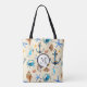 En söt väska med ett monogram initialt. Ett summerat tropiskt tema mönster fyllt med föremål från stranden. Krabbor, sjöar, stjärnfiskar och ankare. Gräs och blått färg.