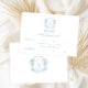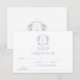 Fintvätt romantiskt blått svarsinslag i bröllop med OSA kort med brud och groommonogram på vintagens vapensköld dedikerad med blått och vitt blomsblomma.