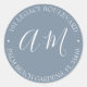 Försegla ditt gratulationskort eller orange poppies bröllopskuvert för blommigt med dessa elegant solida klistermärken för returadress i färg som innehåller ditt monogram i manuell brev-manustypografi som har bearbetats till design på en fast dammig blå bakgrund. Anpassa med din returadress i vitt runt cirkelns kant. Designad för att matcha min inbjudan till solros och eucalyptus lövs. Mer information finns på www.zazzle.com/dotellabelle