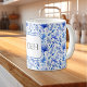 Koboltblått på vita vattenfärgade tropiska löv mönster dekorerar detta klassiska mugg 11 oz. Större kapacitet för hett- eller kall-drycker. Ändra enkelt initialer i ramad monogram med hjälp av mallen som anges. Finns även i 15 oz och många andra stilar i mugg. Se "Om den här produkten" på sidan för mer information.