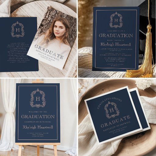 Monogram Crest Navy Rose Gold Graduation SuiteDesignad av Akhates Designs