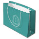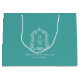 This elegant modern wedding gift bag features classic white text on a turquoise background. A white vintage foliage wreath crest surrounds the couple's monogram initials, with their names and wedding date below.