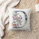 En vacker monogram D med akvarellblommor i blått, fersken och vitt på dekorativ kudde.
