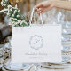Denna elegant har en dammig blårak konsthandning av blad som omger ett monogram initialt i klassiskt manus. Anpassa den med parets namn och bröllop-datum i dammig blå på vit bakgrund.
