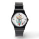 Stiligt svart silikontillbehör med sifferur för runt armbandsur. Det fantasifulla urtavlan har en akvarellillustration av en turkos tekanna som föreställer ett sagohus dekorerat med färgglada vilda blommor, en röd trädörr och stege. Eleganta svarta initialer i monogram kan enkelt bytas ut eller tas bort. Denna design passar de klara och vita silikonarmbanden. Tillgänglig är även en matchande denimjacka, totebag, plus-size och basic t-shirt.