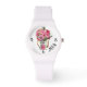 Modern vit silikonrem runt ur med snygga primära siffror. Urskivan har en charmig design av ett sagotehus i form av en tekanna, fylld med vackra rosa rosor och bitar av gröna blad. Tekannan är prydd med stora gröna prickar, en ljusröd dörr och handtag och tut i skinande guld. Eleganta svarta monograminitialer kan enkelt bytas ut eller tas bort. Denna design passar de svarta och klara silikonurklockorna. Även tillgänglig är en matchande denimjacka, totebag, plus-size och basic t-shirt.