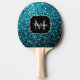 Vattenblåsparkles Monogram Ping Pong Paddle. Anpassa pongutrustning med gnistrande pong med ditt initialsystem och namn. Vackra glamorösa ljusblå glansig glitter-gnistor. Foto av cyan blue sparkles inte glitter!