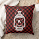En kudde som presenterar ett rött och svart plädmönster för arv (buffel) beklär och drar tillbaka på. Bekläda särdrag en vitillustration av en olje- campa lykta. Personifiera det initialt på lyktan.
