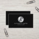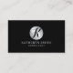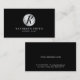 En modern elegant-snyggt som betecknar ett svart skriptmonogram i silver cirkel inslag med affärsinformation i silver professionell font stil på svart bakgrund.