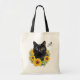 Bomullspåse med svart kattdesign. Lägg till ditt första namn i svart högst upp. Den illustrerade utformningen har en svart katt som bär solroskran. Utformningen skrivs ut på ena sidan med handtaget färg.