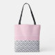 Monogrammed grått och vit chevron mönster med pastelliserad rosa och vit polka punkt All-over-Print Tote Bag. Utformningen har ett grått- och vitt chevron mönster på grund-halvan och på den översta halvan av en pastelliserad rosa och vit polka-punkt mönster. Utformningen korsas av ett pastellband och i mitten finns en pastellrosa med anpassningsbarna initial.