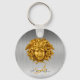 Nyckelkedjan anpassade metall med faux silver metallisk bakgrund. Det här är en anpassningsbar av chic haute couture med monogrammet av en guldmedusmask som ursprungligen skapades med gylt bronze i Frankrike circa 1875. Den ursprungliga masken ägdes av den berömda finansmannen John Pierpont Morgan. Den ursprungliga masken i Art nouveau ligger nu i konstverket Metropolitan Museum. Enligt den gamla grekiska mytologin var Medusa, som också kallas Gorgo, en av de tre hemska magiska Gorgons, som vanligtvis framställs som vingade humana hondjur med levande giftiga serpenter i ställe i håret på huvudet. Alla som har tittat på Medusas ögon lär ha förvandlats till sten. Du kan enkelt ändra bakgrundsbilden färg, inledande engramsstavning, stavning i namn; teckensnittet stil, färg och storlekt med knappen Zazzle Personalize.