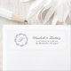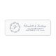 Den lämnat sidan av denna bröllopsinbjudans returadressetikett har en monograminledande inmatningsblått omgiven av en konsthög av lövning. Lägg till namn i indigo Blue Classic script och adress nedan.