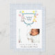 Bedårande monogram initialer med akvarell vapensköld med djur med en blekblå och vit gingham kant Födelse meddelande för baby pojke.