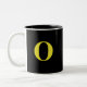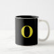 Kaffet mugg är Black over White. Ett monogram sitter i mitten för att du ska kunna anpassa dig. Här visas ett exempel på monogram av ett "O" i ljusstark Gult. Black insida. Ändra färg, insida, text osv. .