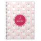 En bärbar spiral-dator med ett eget namn och ett monogram initialt inuti en rosa röd cirkel. Designad med ett sött mönster av sovande kattunge runt tittar fredligt och lycklig. Rosa bakgrund.
