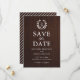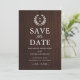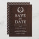 Anpassade spara datum meddelande med lagerkrans, engramkalligrafi, diagonal rand mönster och enkel typografi på träbakgrund. Det här spara datum meddelande är perfekt för rustik bröllop, boho bröllop, ladan bröllop och liknande teman.