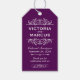 Perfekt för vinodlingar bröllop eller vin flaska är till fördel, dessa elegant vintage blomstrar i stil-kardstamsbrickor med ett personligt bröllp monogram med brud och brudgumms namn, bröllop datum, typ av vin och tack för ett budskap som kan vara helt personlig. Vit text om anpassningsbar plum lila bakgrund färg.