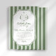Celebrate your new addition with this "Little Putter on the Way" golf-themed baby shower invitation. Featuring classic preppy sage green stripes and a vintage monogram crest illustration, this elegant design is perfect for a country club luncheon or a sporty backyard celebration. Easily customize with your event details to create a timeless keepsakes for the par-tee!