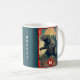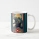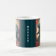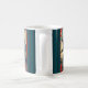 Start the day out something fierce with your favorite beverage while using this cool, striking, unique, custom monogram name coffee mug. A retro vintage, green blue lizard monster appears over a landscape with mountains, pagoda, a fan sun and your monogram initial. The background sports teal blue stripes along with your name. Add your personal initial. Personalize with your name and initial. Makes a fun and bold statement every time you use it. Makes a great gift for someone special, even yourself!