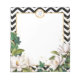 Add a touch of elegance to your everyday with this personalized monogram notepad. Featuring a striking black and white chevron pattern, gold trim, and beautiful magnolias and ivy accents, this notepad is as stylish as it is functional. The gold glitter adds a hint of sparkle, making it the perfect gift or personal stationery. Customize it with your initials for a truly unique touch. Perfect for note-taking, journaling, or gift-giving, this notepad brings both beauty and practicality to any occasion.