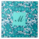 Skriptmonogram med en slitis av blommor och löv i turkos-, teal- och pastellblått, accentuerad med vit, med ljusblå bakgrund