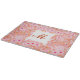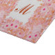 Skriptmonogram med ett mönster av blommor och löv i nyanser av mjuk rosa, persikor och aprikos, med djupa blomcentrum och en gräddvit bakgrund i rosan