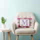 En personlig kudde med monogram och blomsterbukett bestående av ljusa rosa rosor och mörka rosa vallmor med frodiga gröna blad. En ram lagd överst för att placera din egen text inuti. Bakgrunden är ett mjukt pastell rosa randigt mönster.