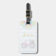 Monogram Modern Bike Luggage Tag. Framsida: rosa cykel med blommigt basket. Pastellblommor, bär och löv (rosa, blått, turkos, guldbär). Golden Custom Name. Ljusblått rand. Baksida: blått rand, blommor, mobilt nummer på anpassningsbarna. Modern, söt och romantisk.