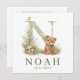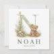 Een zacht en stijlvol geboortekaartje met een handgeschilderde waterverf illustratie van een monogram letter N, versierd met een lieve beer en bosplanten in rustige groentinten.