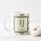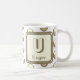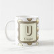 Det här monogramteet eller kaffet mugg är ett underbart sätt att lägga till en oväntad accent i morgonrutinen. Ett gyllene geometriskt mönster visas mot en gräddbakgrund på båda sidor om mugg. "U" i brev visas på en kvadrat tillsammans med familjen namn. Brev och ert namn kan snabbt och enkelt vara personlig. Ursprunglig design - C. McGouldrick