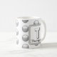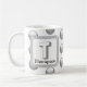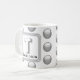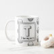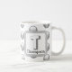 Det här monogramkaffet mugg är ett underbart sätt att lägga till en oväntad accent i morgonrutinen. Ett silver grått-geometriskt mönster visas mot en vit bakgrund. Brev ’T’ visas på en kvadrat tillsammans med familjen namn. Brev och ert namn kan snabbt och enkelt vara personlig. Ursprunglig design - C. McGouldrick