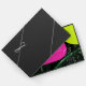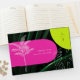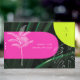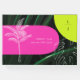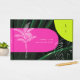 Neon rosa och gult visas över mörken handflatan löv med monogram, namn och datum och vita teckningar i handflatan löv.