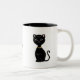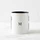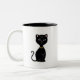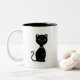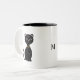 Monogram på mitten och söt svart katt tecknad figur på vit mugg.