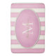 Detta anpassningsbar badmatt har ett blek elfenbensmonogram i ett ovalt ram, med bred bakgrund av rand i ro rosa och antikvite.