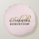 Elegant refined feminine chic round throw pillow, personalizable customizable with monogram, initial letters and name. Soft stylish pastel candy pink background, elegant gold calligraphy script handwritten initial letters, and classy black serif typography for the name. Feminine, pretty, girly, useful home decor item to embellish the living room, bedroom and more. Premium look, monochrome, minimalist, simple, monogrammed, easy to match in any ambient. Make a statement with this unique home decoration, or make a thoughtful custom gift under 40 dollars for her. Suitable for many occasions and celebrations, like birthday, Mother’s Day, Christmas, graduation, anniversaries. Also a beautiful aesthetic housewarming, new homeowner gift, or present for a perfect host that loves decorating with style.