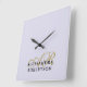 Personalized modern elegant refined feminine chic square wall clock, personalizable customizable with monogram, initial letters and name. Soft stylish trendy pastel purple lavender background, elegant gold calligraphy script handwritten initial letters, and classy black serif typography for the name. Feminine, pretty, girly, useful wall art decoration item. Premium look , monochrome, minimalist, simple, monogrammed, easy to match in any ambient. Decorate your living room, bedroom, dining room, even kitchen or make a thoughtful custom gift under 45 dollars for her. Suitable for many occasions and celebrations, like birthday, Mother’s Day, Christmas, graduation, anniversaries. Also a beautiful aesthetic housewarming, new homeowner gift, or present for a perfect host that loves decorating with style. A great idea to be used when staging a house for sale, to attract potential buyers.