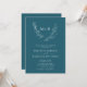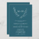Elegant Botaniskt Monogram Laurel- utandning QR OSA Teal Blue Bröllopsinbjudan... På framsidan av vår elegant-inbjudan med ett monogram-bröllop finns en luffisk botanisk lagerkrans som visar initialer från bruden och brudgummen ovanför personligens inbjudningstext i skarp vit serif och sans serif-typografi på en tealblå bakgrund. Baksidan av inbjudan visningar bröllop webbplats QR-kod och webbplatsens egen URL, vilket gör att dina inbjudna enkelt kan OSA online och visa alla uppgifter som normalt skickas i ett bröllop-paket. Exemplet QR-kod och all exempeltext (förutom calligraphy inslag) kan enkelt revideras med egna uppgifter om anpassningsmallen.