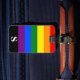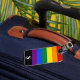 Bagagemärke med lesbisk, bög, bisexuell, transgent (HBT) pride regnbåge mönster med färg av rött, orange, gult, grönt, blått och lila med vitt monogram på svart rand. Anpassa med den inledande informationen för monogram, namn och adress med de enkla mallarna. Teckensnitt färg, stil och storlekt teckensnitt är anpassade.