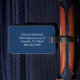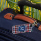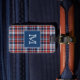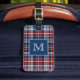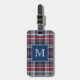 Monogrammad Luggage Tag med rött, vitt och blått Tartan mönster och din första inramning i blått fyrkantig med vitt gräns.