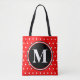 Fashionable, reversibel vit polka dots mot röd bakgrund. Anpassa med din monogrammade inledande text i vit text. Baksidan av väskan har ordalydelsen: Ha en vacker dag. Lämna formulering, infoga en egen eller radera. Nya trendigets geometriska kvinnoväska mode under vilken säsong som helst. Originaldesign © TamiraZDesigns. www.zazzle.com/tamirazdesigns