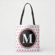 Fashionable, reversibel vit polka dots mot röd bakgrund. Anpassa med din monogrammade inledande text i vit text. Baksidan av väskan har ordalydelsen: Ha en vacker dag. Lämna formulering, infoga en egen eller radera. Nya trendigets geometriska kvinnoväska mode under vilken säsong som helst. Originaldesign © TamiraZDesigns. www.zazzle.com/tamirazdesigns
