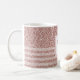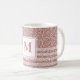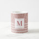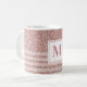 Kaffet mugg har en anpassningsbar monogram på en vacker bakgrund av faaux glitter i ro, accentuerad med en genomskinlig vit mönster i rand.