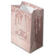 En presentpåse för en glamorös bröllop. Ett faux ro guld-bakgrund med elegantens rosa och ro glitter droppar, färgdropparnas utseende. Personalize och the new weds monogram, skrivet i burgundy med ett modernt handskript i stil