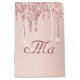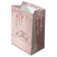 En presentbag för ett glamouröst bröllop. En falsk roséguld bakgrund med eleganta rosa och roséguld glitterdroppar, målade droppande effekter. Personifiera och det nygifta parets monogram skrivet i burgunder med en modern handskriven stilsnurr